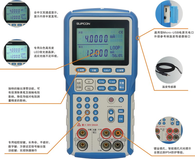 · 最高準確度:±0.01% · 外置傳感器典型準確度:±0.2℃ · 信號測量/輸出清零 · 帶過流保護的24V直流電源 · 電壓測量/輸出 · 電流測量/輸出 · 24VDC配電/回路電流測量 · 脈沖計數(shù) | · 幅值可調(diào)的脈沖信號輸出 · 頻率測量/輸出 · 電阻測量/輸出 · 引線電阻補償功能 · 14種RTD、TC測量/輸出 · 測量/模擬低于0℃的熱電勢值 · 內(nèi)置90國際溫標雙向查表 · 攝氏度及華氏度溫標切換 | · 手動和自動冷端補償 · 模擬二線制變送器信號 · 自動步進和斜坡輸出 · 小型化設計,便于手持攜帶 · 智能閃光插孔指示 · 中文操作界面 · Micro USB電源充電口 · 防護等級IP54 |