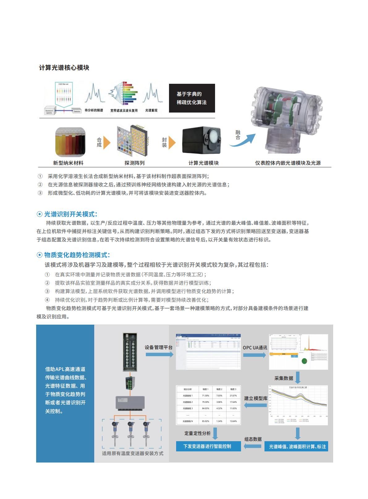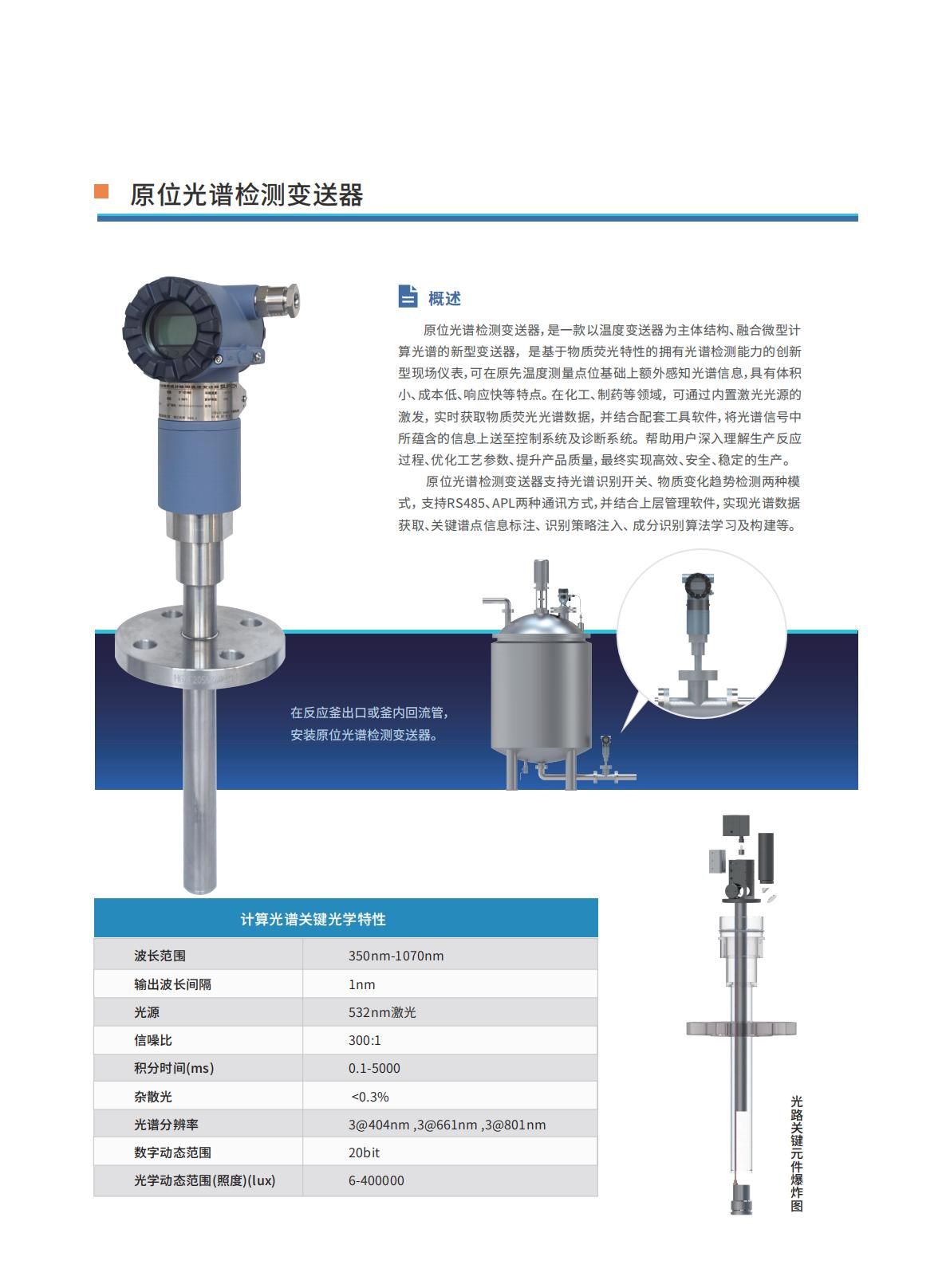 原位光譜檢測變送器,是一款以溫度變送器為主體結構、融合微型計算光譜的新型變送器, 是基于物質熒光特性的擁有光譜檢測能力的創(chuàng)新型現(xiàn)場儀表,可在原先溫度測量點位基礎上額外感知光譜信息,具有體積小、成本低、響應快等特點。 在化工、制藥等領域, 可通過內置激光光源的激發(fā), 實時獲取物質熒光光譜數(shù)據(jù), 并結合配套工具軟件,將光譜信號中所蘊含的信息上送至控制系統(tǒng)及診斷系統(tǒng)。 幫助用戶深入理解生產(chǎn)反應過程、優(yōu)化工藝參數(shù)、提升產(chǎn)品質量,最終實現(xiàn)高效、安全、穩(wěn)定的生產(chǎn)。原位光譜檢測變送器支持光譜識別開關、 物質變化趨勢檢測兩種模式, 支持RS485、APL兩種通訊方式,并結合上層管理軟件,實現(xiàn)光譜數(shù)據(jù)獲取、關鍵譜點信息標注、 識別策略注入、 成分識別算法學習及構建等。